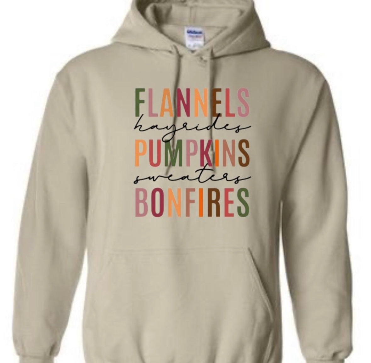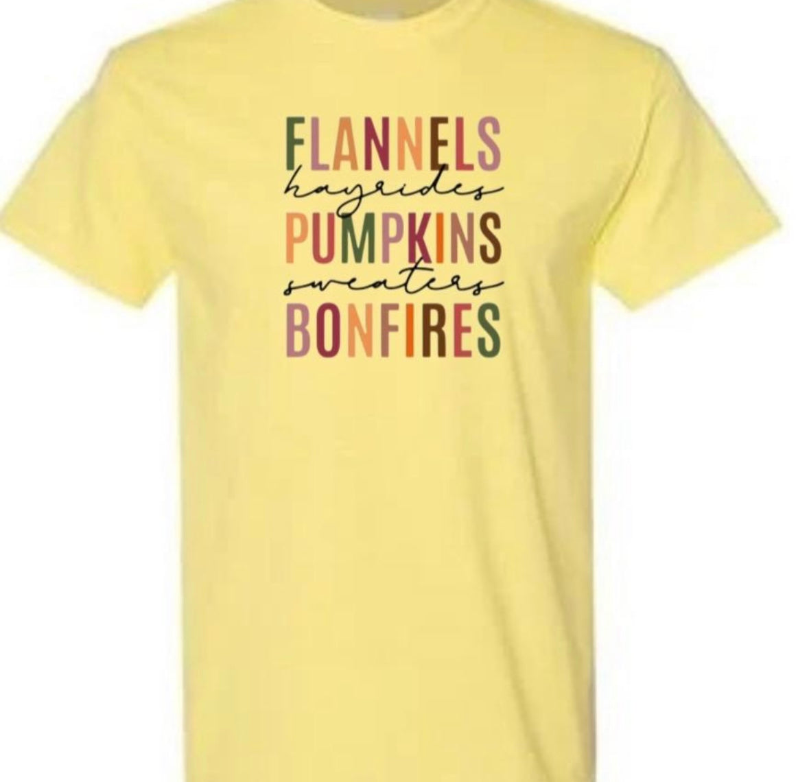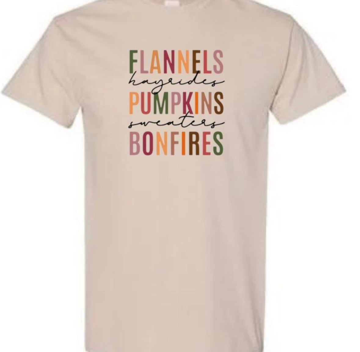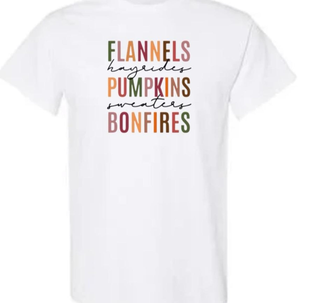 Celebrate the cozy fall season with our Flannels, Hayrides, Pumpkins, Sweaters, Bonfires shirt. Made with soft material, perfect for hayrides and snuggling up by the bonfire. The pumpkin graphic adds a festive touch, making it ideal for any autumn outing. Get ready to embrace the cooler weather in style!