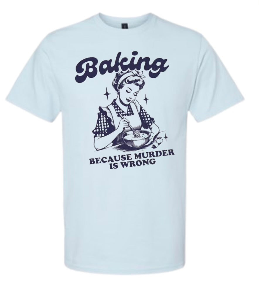 Looking for a quirky and humorous way to express your love for baking? Look no further than our Funny Baking Shirt! With its clever and witty phrase "Baking Because Murder is Illegal," this shirt is sure to draw attention and spark laughter.Crafted from high-quality materials, this shirt is comfortable, durable, and perfect for wearing while baking up a storm in the kitchen. The shirt's design features bold lettering that stands out against the fabric's solid black background.Whether you're looking to add some humor to your personal wardrobe or searching for a gift idea that any baker will appreciate, our Funny Baking Shirt ticks all the boxes. So why wait? Grab yours today and let everyone know that you're serious about your love of baking!