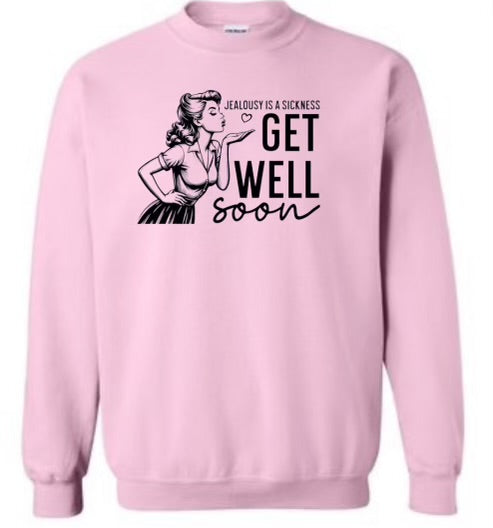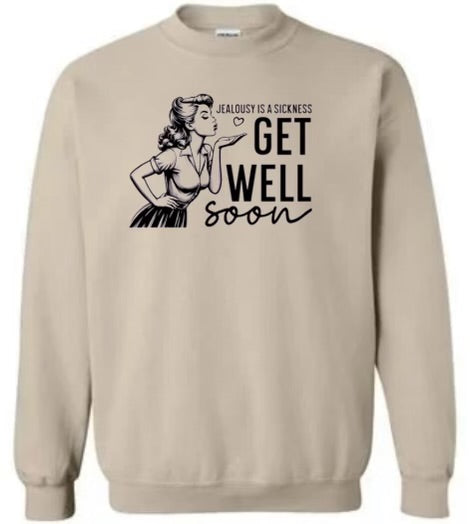 Stay light-hearted and stylish with our Jealousy is a sickness get well soon sweatshirt. This funny sweatshirt reminds us to not take ourselves too seriously and to spread joy instead of envy. Made from comfortable materials, it's perfect for casual wear or as a thoughtful gift.