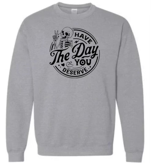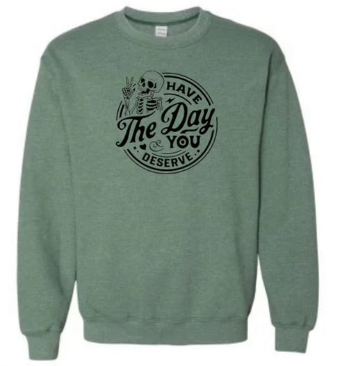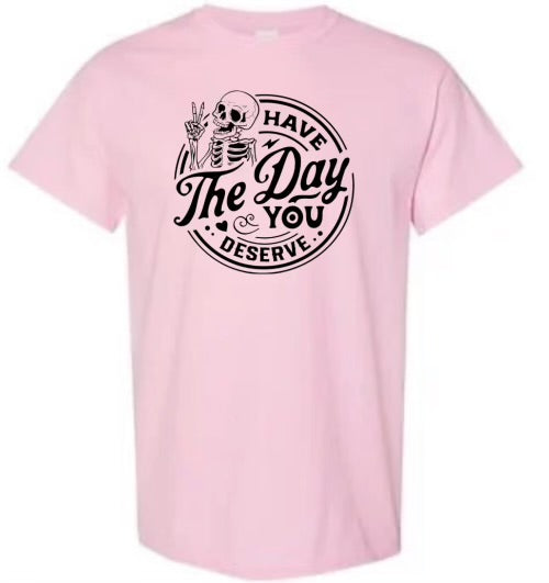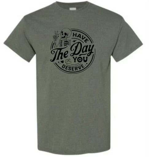 Elevate your style and mood with our "Have the day you deserve" sassy and funny shirt. Guaranteed to bring a touch of sass and humor to your day. Comfortable and stylish, this shirt is perfect for anyone looking to make a statement. Get ready to have the day you deserve!