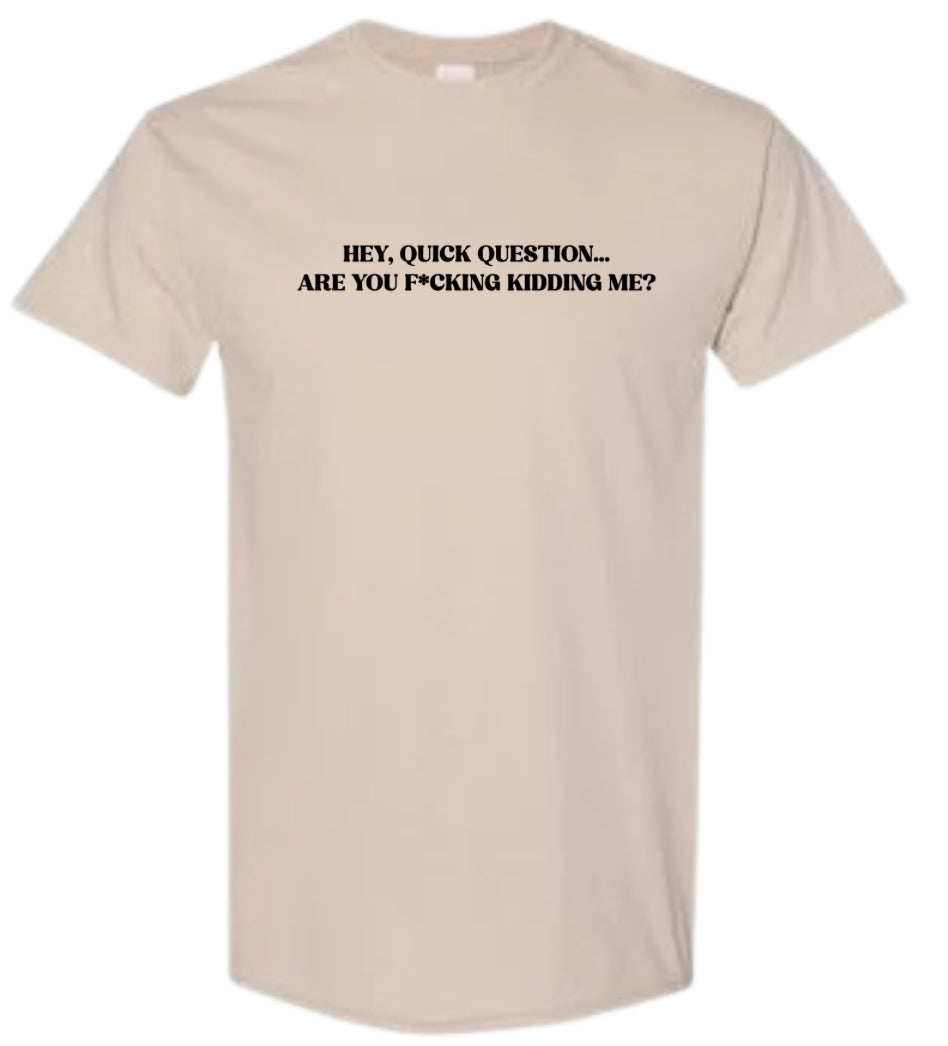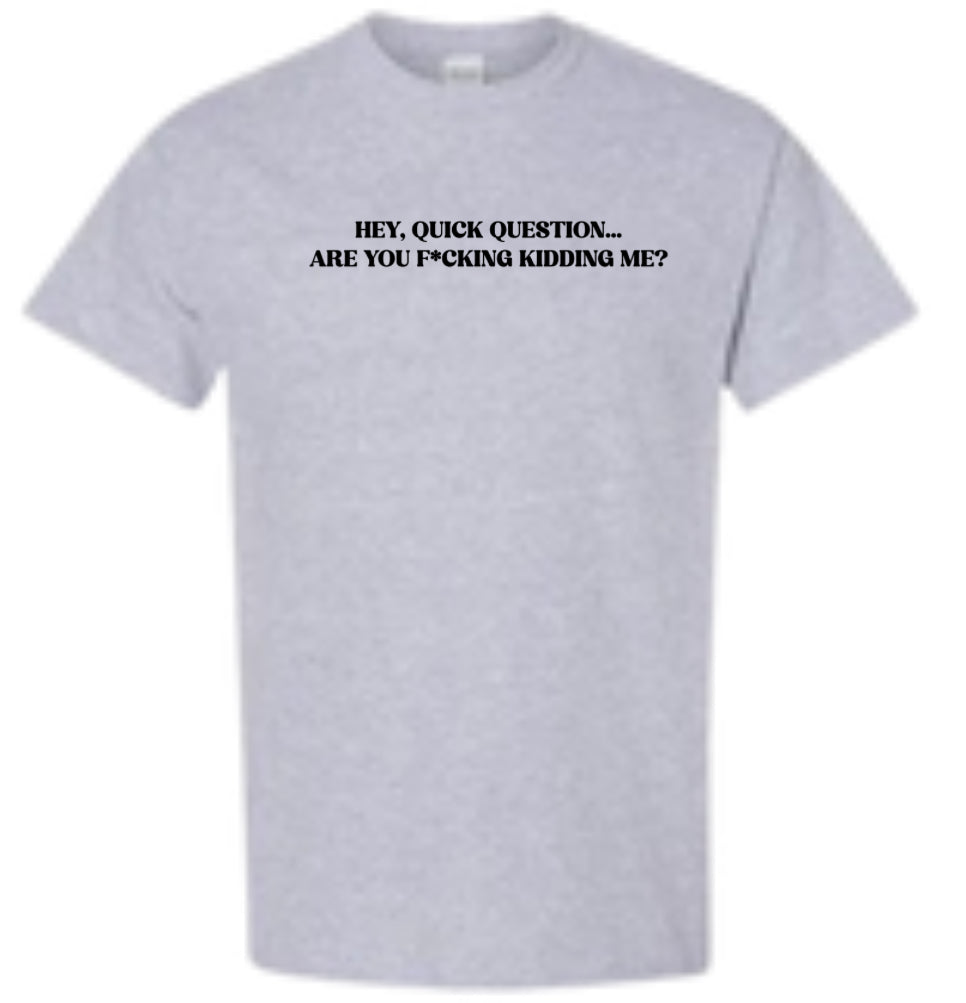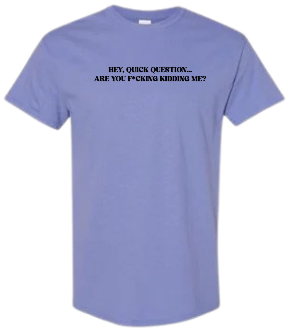 This hilarious shirt, featuring the phrase "Hey quick question... are you f*cking kidding me?", is perfect for those with a funny sense of humor. Made with high-quality materials, it's comfortable and sure to make a statement. Add some laughter to your wardrobe with this shirt.