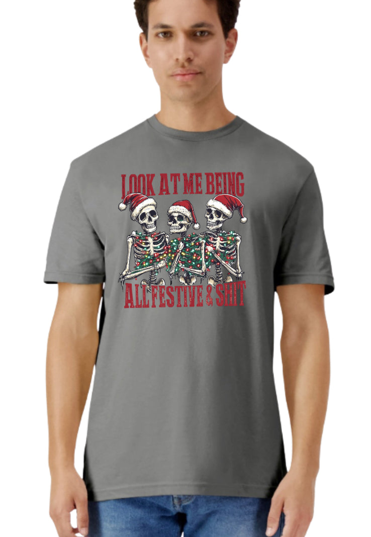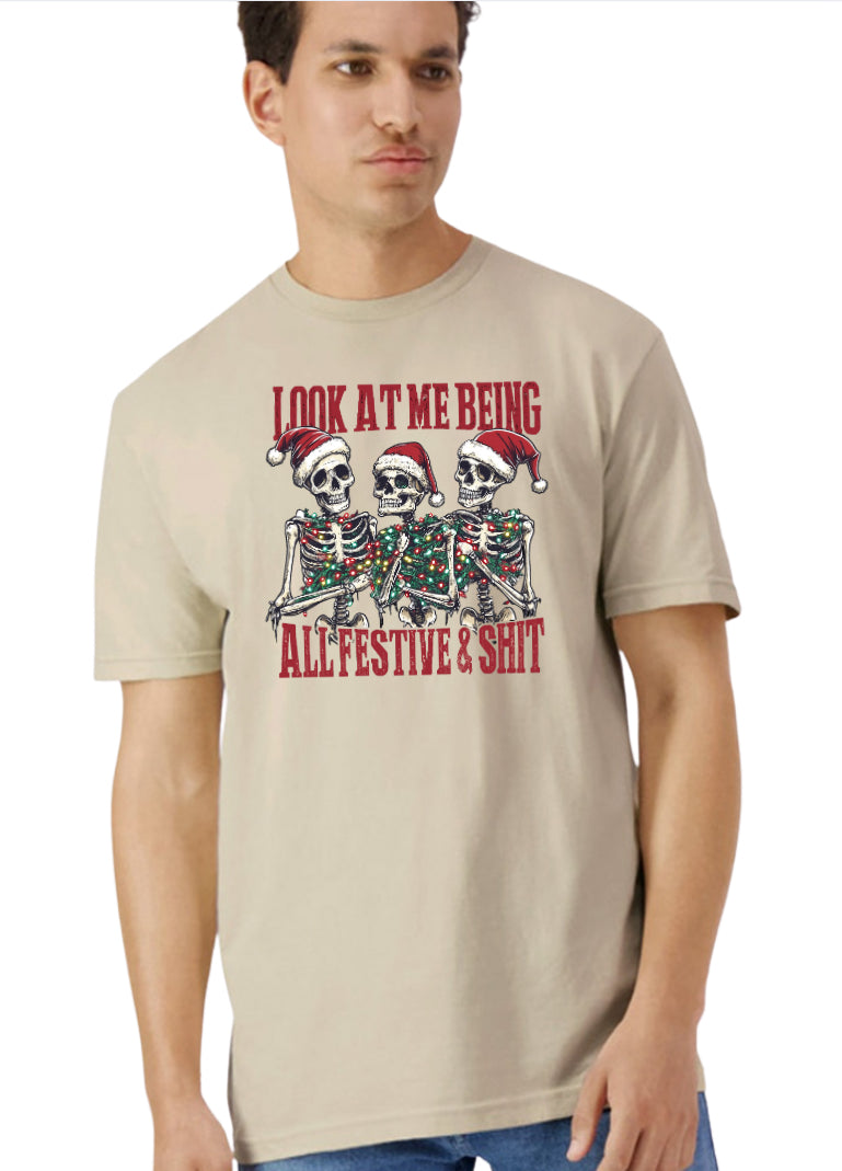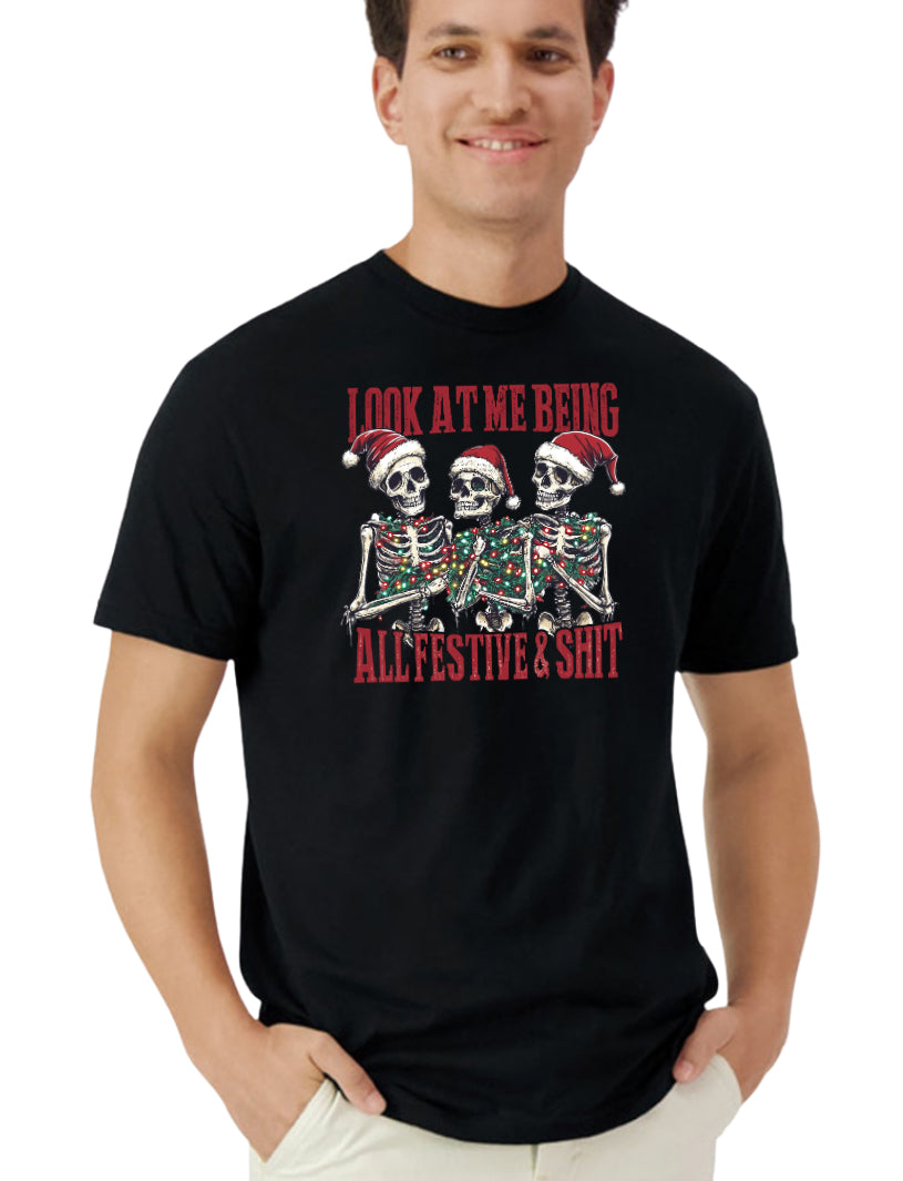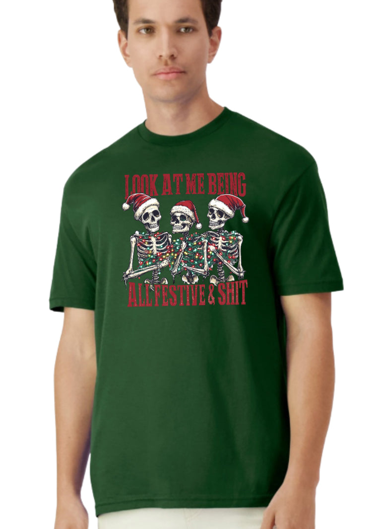 Celebrate the holidays with a bold twist wearing the "Look at Me Being All Festive" skeleton Christmas shirt. This unique design combines festive spirit with edgy style, perfect for standing out at any holiday gathering. Crafted for comfort and eye-catching appeal, it’s a great choice for those who want to blend humor and holiday cheer effortlessly.