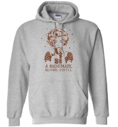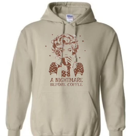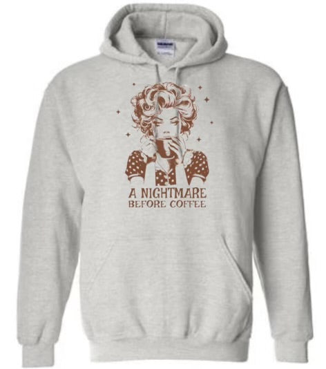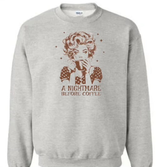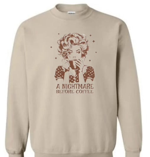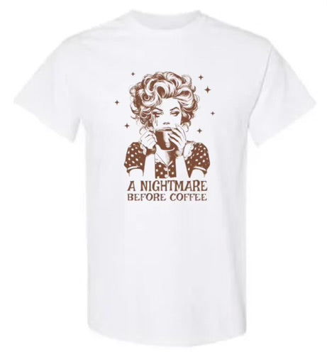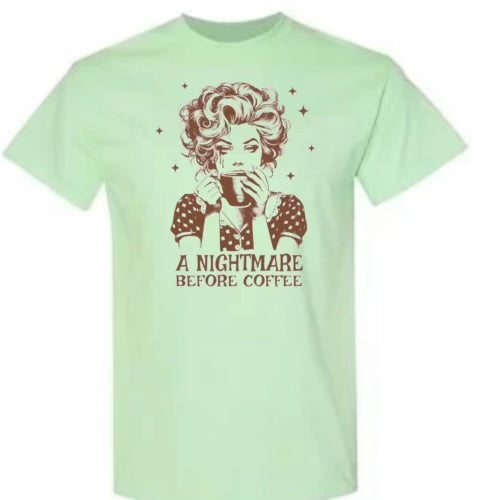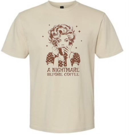 This retro lady shirt will have you doing a double-take with its clever play on words. With its "Nightmare before coffee" design, this shirt is perfect for any coffee lover who appreciates a good laugh. Made with high-quality material, it's both comfortable and stylish. Get yours today!