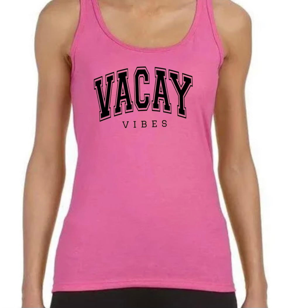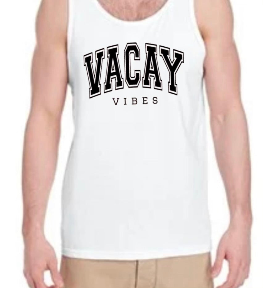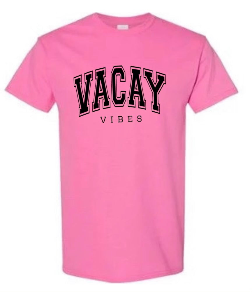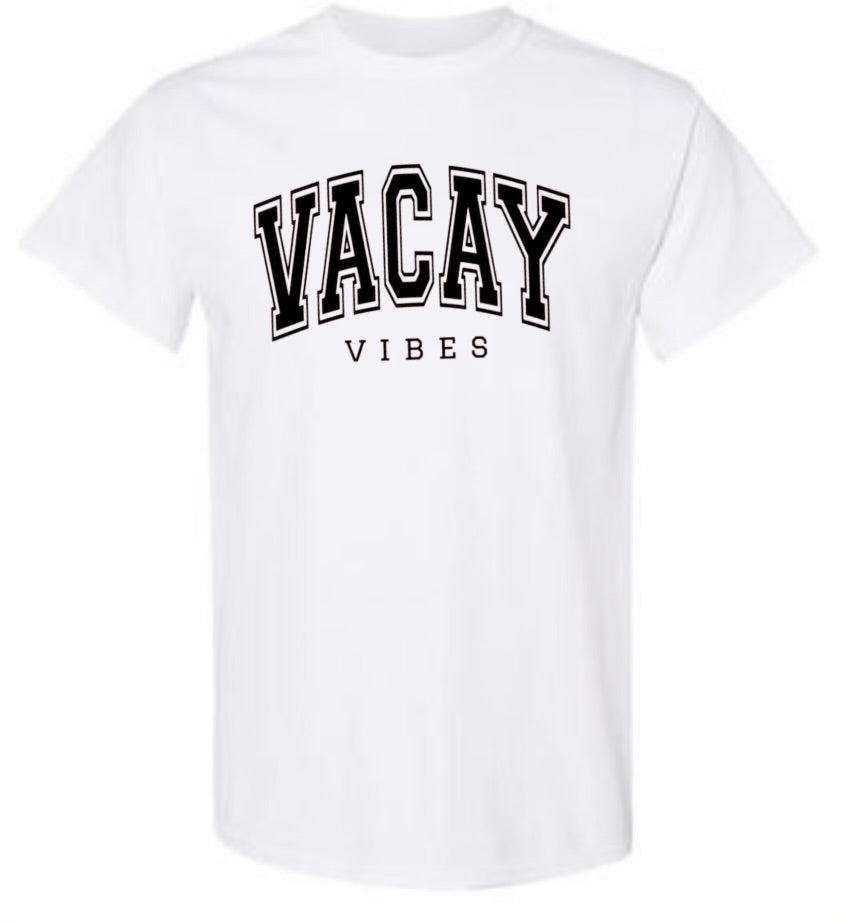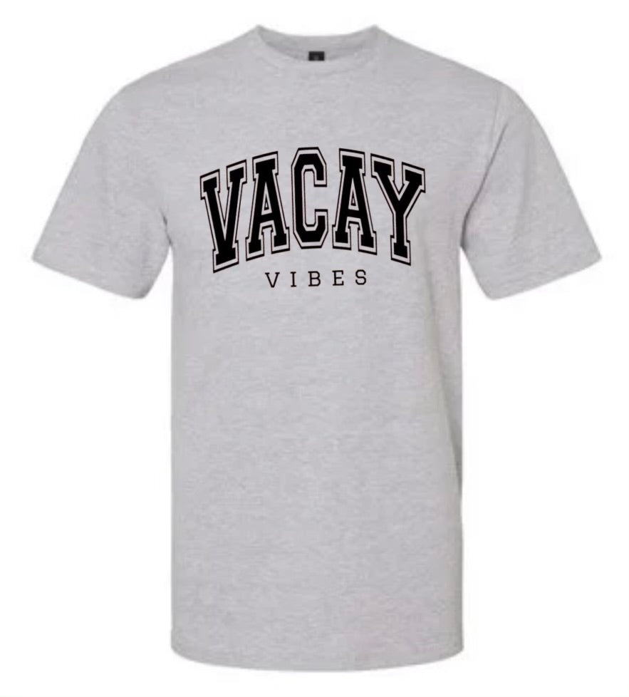 Whether you're lounging by the pool or exploring new sights, this shirt will keep you feeling comfortable and looking great throughout your entire trip. So don't wait any longer - add some VAYCAY vibes to your wardrobe today!