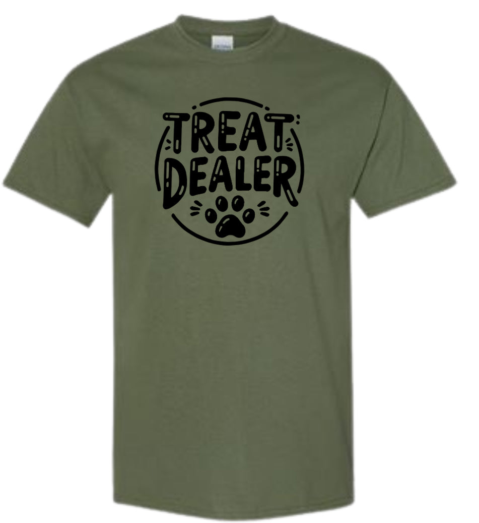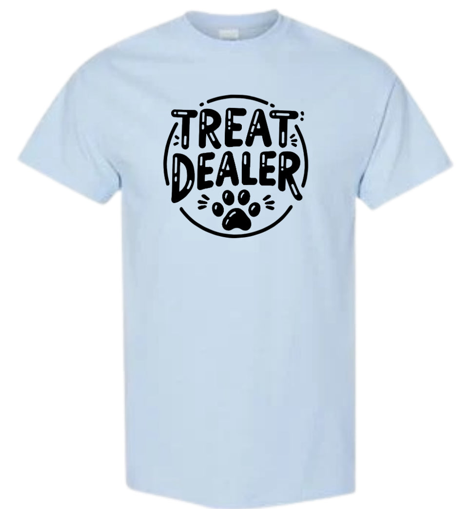 Introducing the Treat Dealer, a must-have for any dog or cat lover! This shirt features a unique design that proudly displays your love for your furry friend. Made with high-quality materials, it's comfortable to wear and is the perfect addition to your wardrobe. Show off your love for your pet with the Treat Dealer shirt.